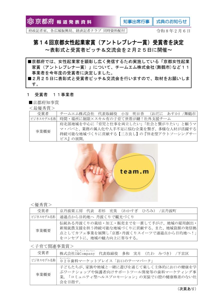 このたび、team.m株式会社 代表の小谷明日香 が、令和8年2月6日付で発表された「第14回 京都女性起業家賞(アントレプレナー賞)」において、京都府知事賞 最優秀賞 を受賞しました!